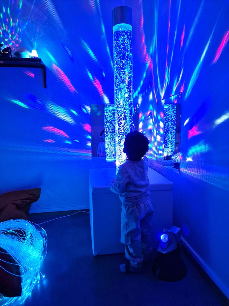 Le matériel proposé a des propriétés particulières : tactiles, visuelles, auditives et olfactives. L’aménagement comprend une colonne à bulles, des fibres optiques, des objets tactiles, des tableaux sensoriels, des coussins confortables, de la musique douce.
